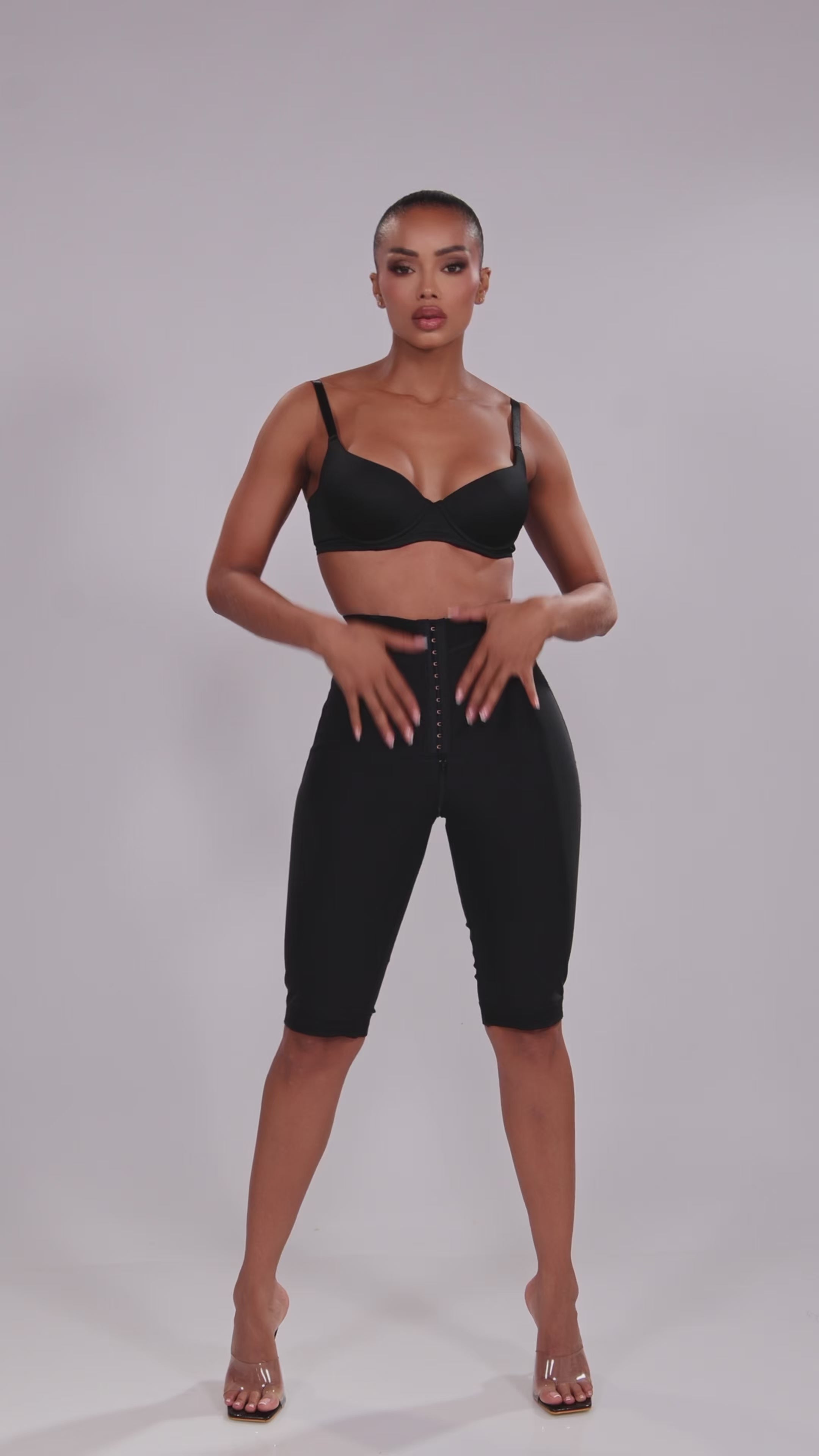 • Talle y compresión media, ideales para favorecer el control en la zona baja del abdomen, evitando la formación de pliegues o rollos y garantizando un ajuste uniforme y estilizado.